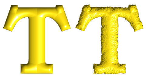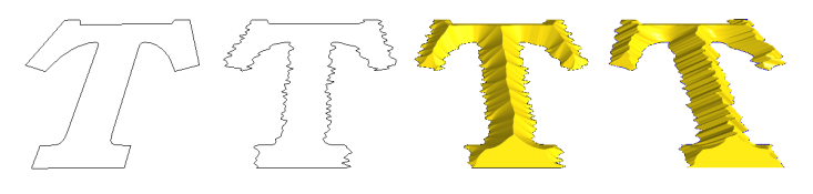 The far left contour is the original, and the right contour has been distorted. The left relief was created by applying a beveled relief to the distorted contour. The right relief was created by applying a beveled relief to the base contour and then adding noise distortion.
